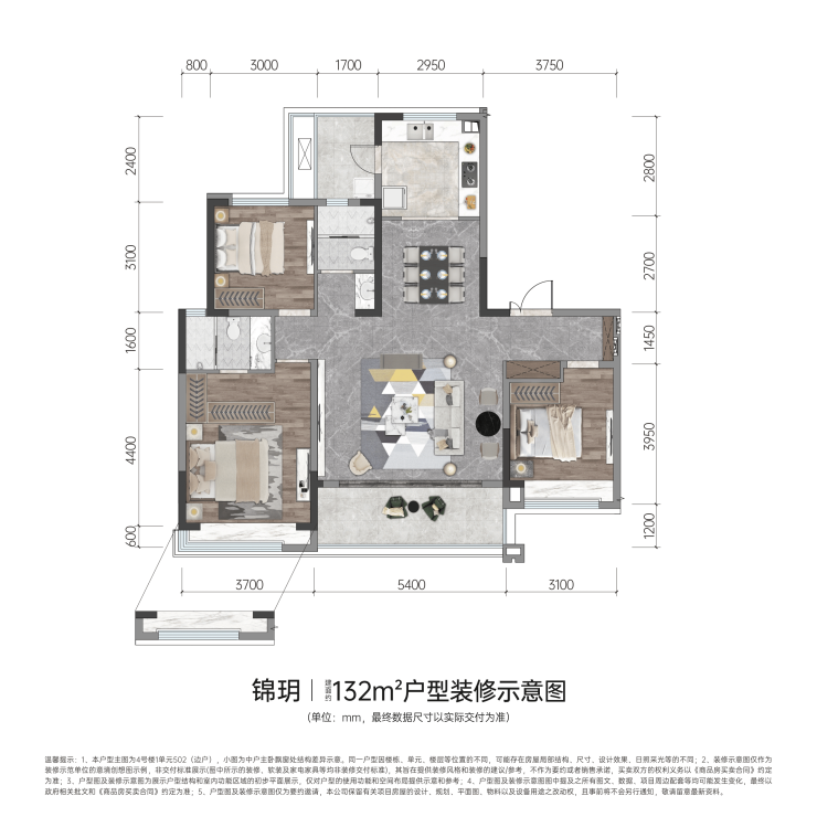 132㎡三室两厅双卫:年轻家庭的舒居优选