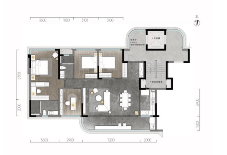 这是项目的旗舰户型,以约14%的低公摊率实现了空间价值的最大化,格局同样为奢阔的四室两厅两卫。整个户型拥有极为阔绰的起居空间和房间尺度,充分体现了高端改善住宅的从容气度。其细节标准与精工品质代表着项目的最高产品力,旨在为城市菁英阶层提供终极的居住体验。