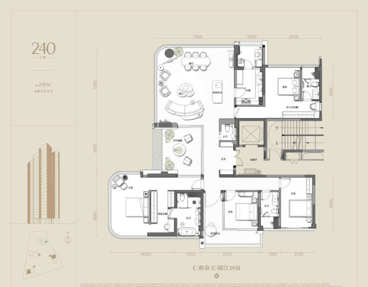 240㎡四室两厅四卫三阳台,大面宽空中花园:
