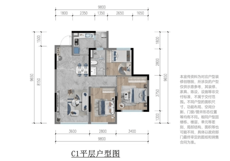 和樾:建面约98㎡三室两厅两卫(北地块15-18F小高层,2T4)