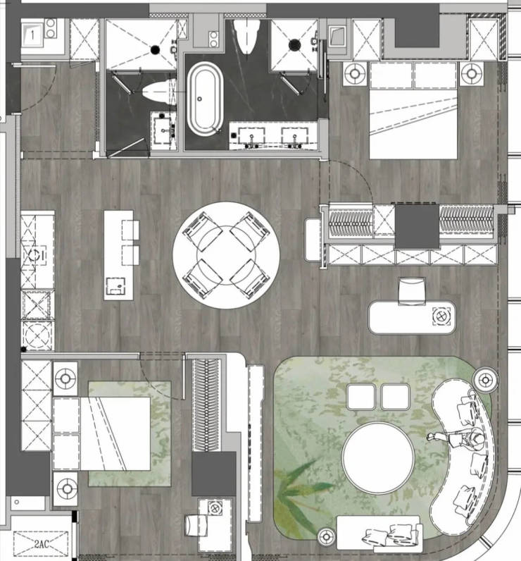 以"竹文化"为设计主题,融合传统元素与现代美学。米白色皮革硬包墙面搭配青绿色调,营造雅致生活氛围。特别设计窗边阅读区,体现东方美学意境。