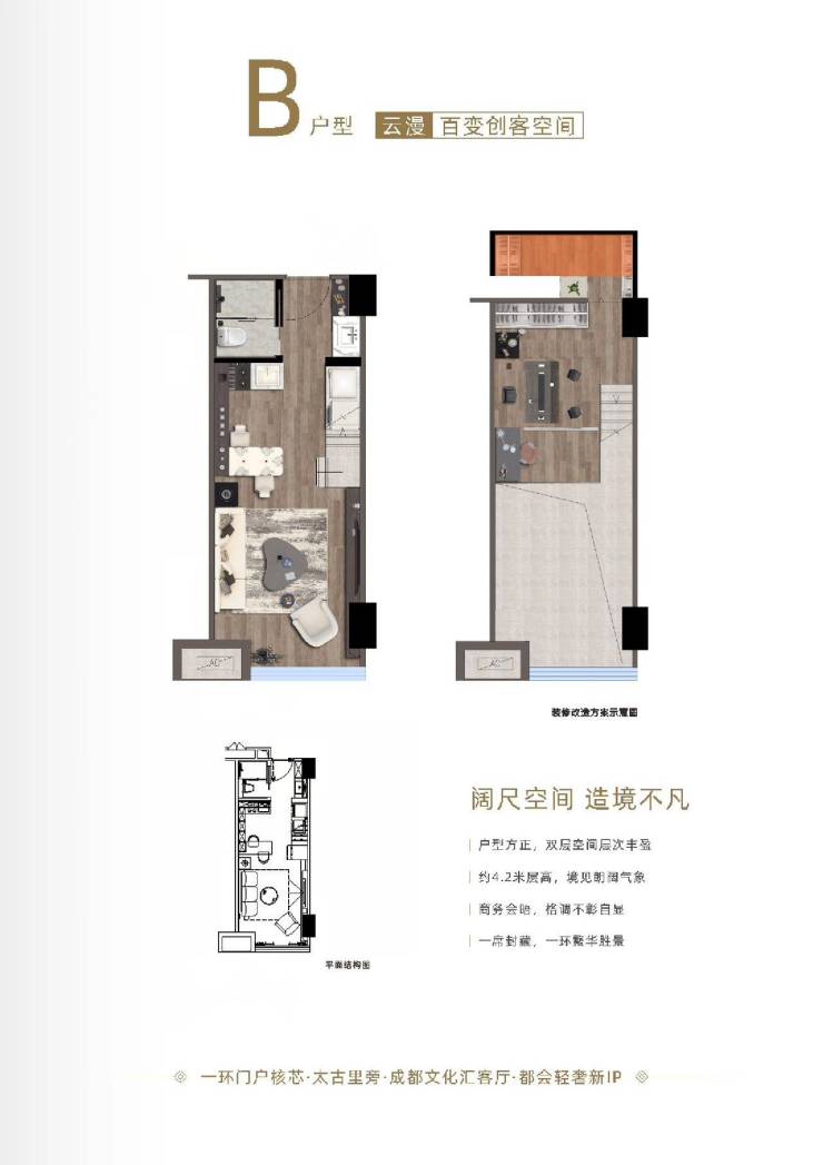 公寓产品:建面约35-42平,主力面积38平,层高4.2米,标准loft公寓,单层面积1100平,可自由组合,随心搭配!