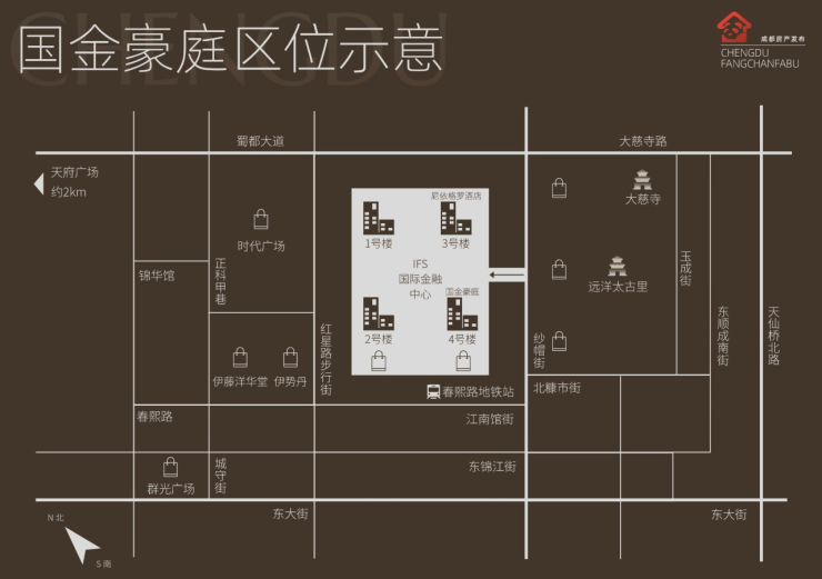 城市核心不可复制:项目直线距离成都 “城市原点”(文武路与锣锅巷交叉口)仅 1.2 公里,是成都 “商业、文化、交通” 三大中心的交汇点 —— 向东 500 米是太古里(成都 “文化商业地标”,年客流量超 1.2 亿),向西 800 米是春熙路(中国 “金街” 前三甲,日均人流量超 50 万),向南 1 公里是东大街(成都 “华尔街”,聚集 300 + 金融机构),向北 2 公里是天府广场(城市政治文化中心)。这种 “城芯中的城芯” 地位,决定了其 “资产抗跌性” 与 “价值成长性”。