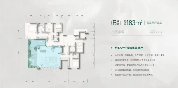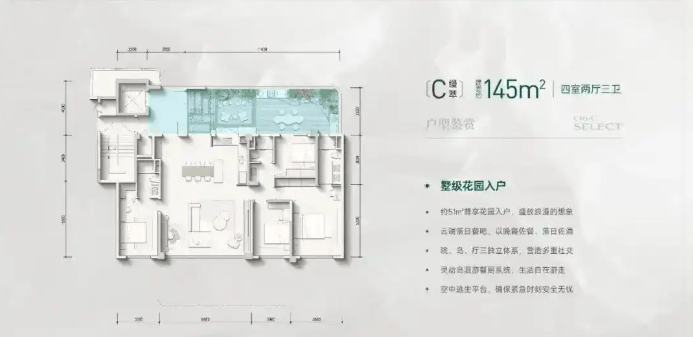 04 主力产品解析 精粹145-183㎡四代住宅,以空中庭院为核心,通过场景化设计满足塔尖家庭对功能、安全与诗意的全维追求