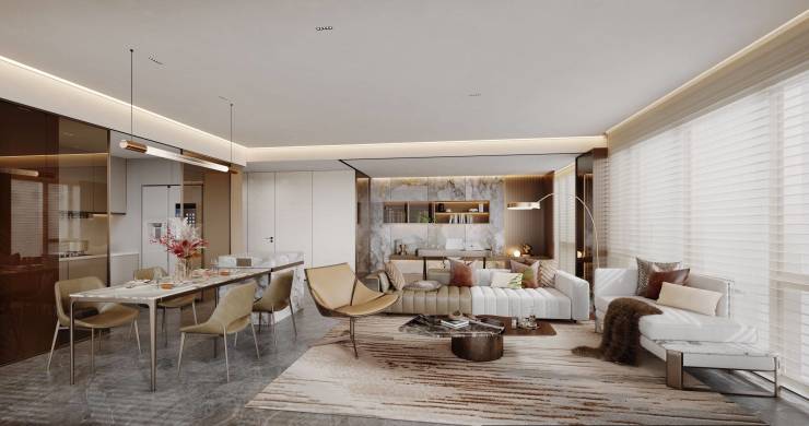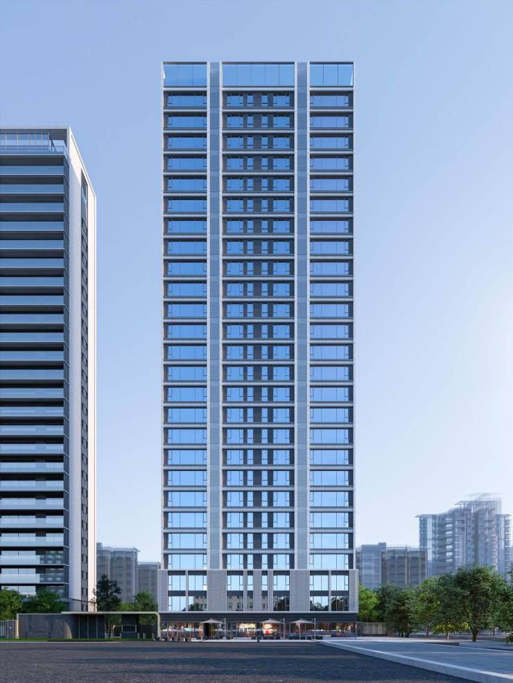 汲取全球地标建筑的立面营造理念,采用米白色、深灰色的颜色打造现代轻奢的高级灰风格,天际光幕外立面,两层挑空入户大堂使用石材、格栅、铝板打造,户内断桥铝LOW-E玻璃和玻璃栏板打造类公建化立面,亮相即是桐梓林颜值地标。