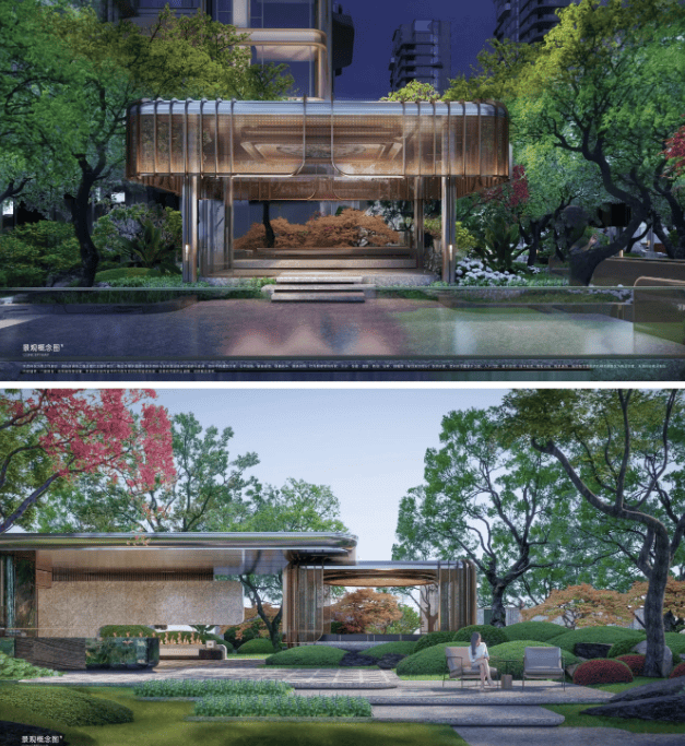 社区内部则以“一轴九礼,一院四庭”为格局,构建约7000㎡的中央森林社交场,打造约2000㎡下沉式会所,及约4700㎡全首层架空区,包含高端项目必备的私宴厅、恒温泳池等。