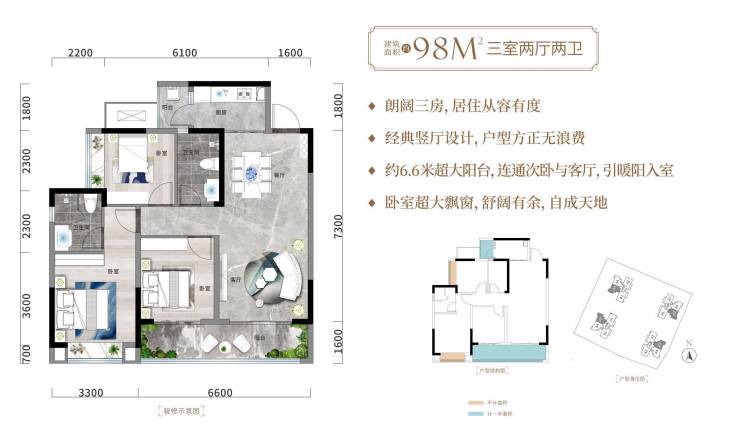 产品特色:创新大横厅设计,三面采光中庭视野。科学动静分区,多功能次卧设计,完美适配多代同堂家庭改善需求。