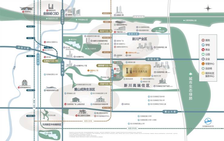 中交天府九章位于新川创新科技园核心区(天府新区新川路与和迎路交汇处),是新川 “产城融合” 规划的 “最后一块低密住区”。其区位优势可总结为 “六大生活场景全覆盖”: