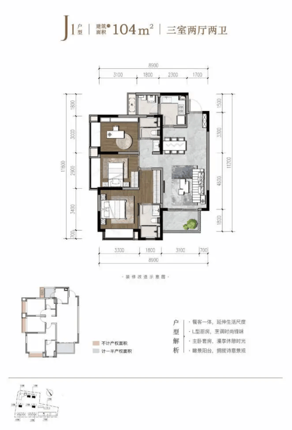 之选,相比89㎡户型,空间尺度更为宽敞。三房两卫的设计完全满足三口或四口之家的舒适居住需求,在主城核心区属于功能与舒适度兼备的实用型产品。
