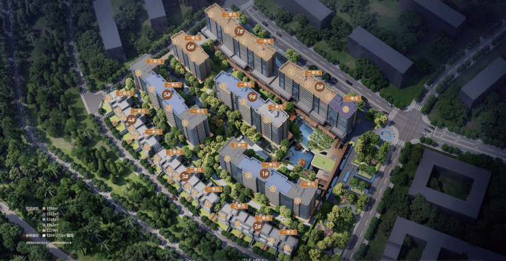 规划布局有6栋190-330m²的庭院洋房以及3栋面积260-269m²的前湾上下叠院,叠拼与门口的市政道路高差在 2.4m,最高可达3m。