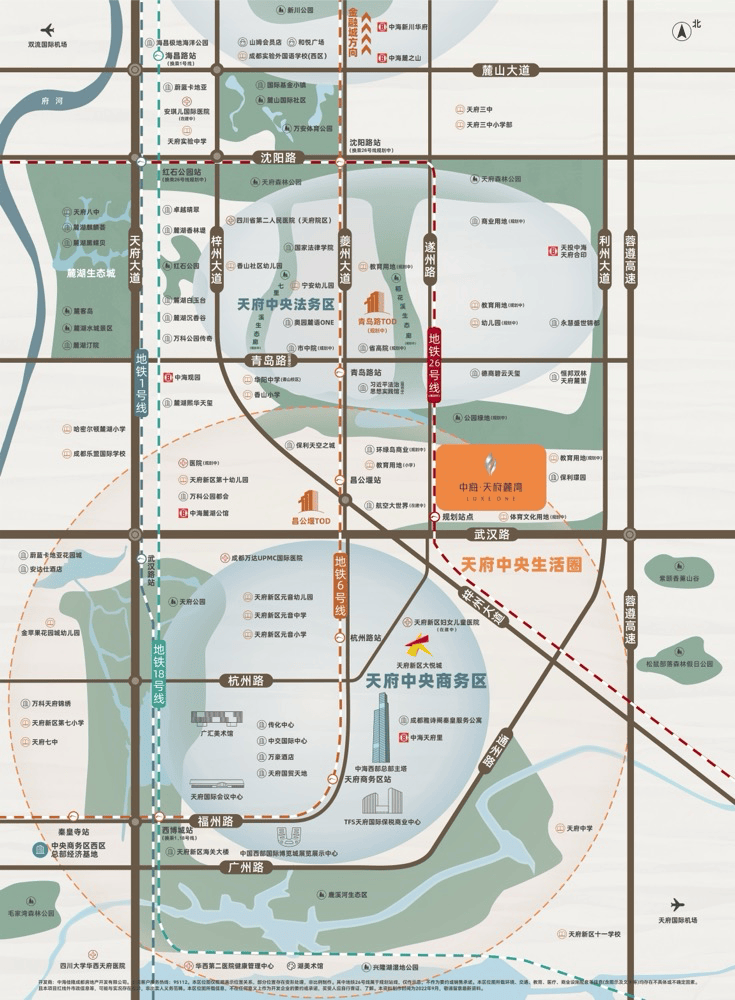 商业集群:3公里内汇聚天府大悦城、和悦广场、麓湖水镇(在建伊藤旗舰店)