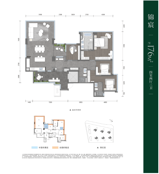 项目主力户型为建面约139㎡和176㎡的“全景墅式大平层”,均设计为套四两厅三卫,主打“全景”视野与“墅式”空间体验。