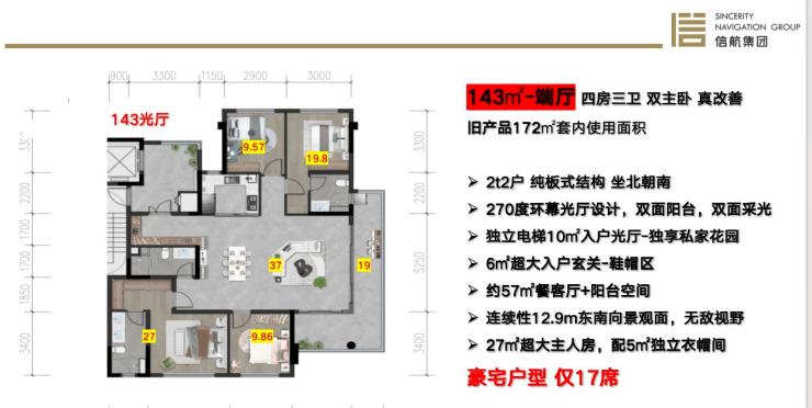 全南向纯板式结构,创新采用横厅+光厅+方厅三维设计体系。每户配置独立玄关系统,配合梯控私密入户。以143㎡户型为例,153㎡实得面积相当市场180㎡产品,独创双主卧+三卫配置。