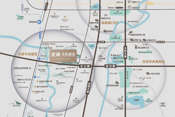 一条正公路+武汉路,划界20分钟奢定生活圈,高效链接天府高规格城市级配套核心,速达怡心湖产业核、天府总部CBD商务核、科学城科创核,高新金融核。