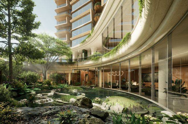 外立面摒弃传统玻璃幕墙,采用暖色仿石铝板与铜色栏杆,而最新调规后增加的玻璃比例进一步强化了“全景舱”视野。