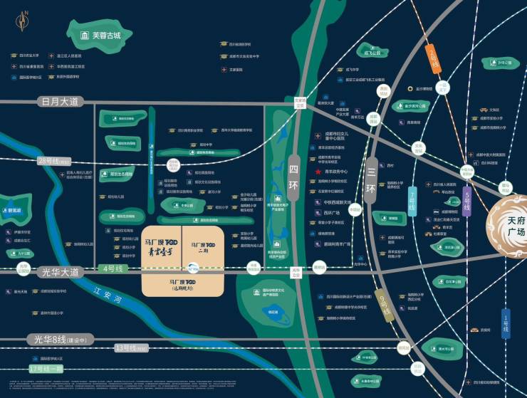 三横一环:日月大道、光华大道、光华8线快速路与四环横纵交汇,快速通达全城。