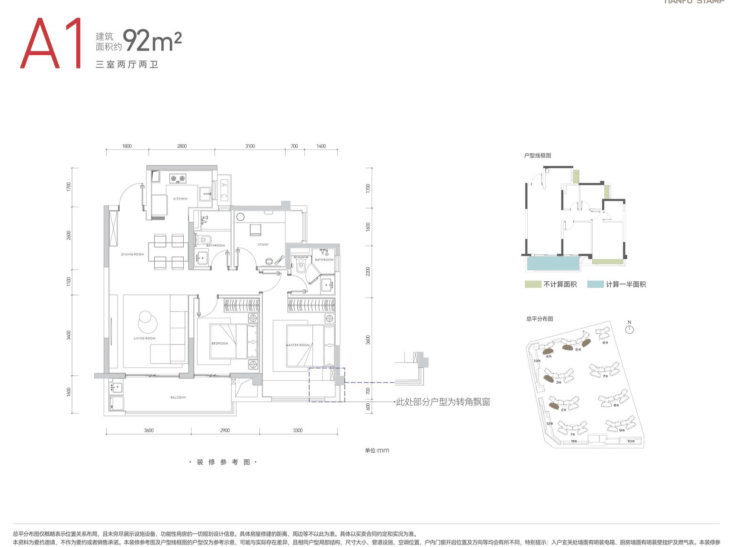 户型设计亮点突出:97㎡实现三房两厅双卫全能布局;9.8米南向面宽,三面采光确保通透性;3.6米客厅与3.3米主卧尺度考究;主卧及书房配备0.7米进深飘窗,拓展实用空间。