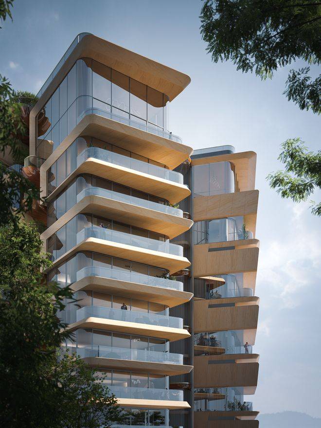 外立面摒弃传统玻璃幕墙,采用暖色仿石铝板与铜色栏杆,而最新调规后增加的玻璃比例进一步强化了“全景舱”视野。