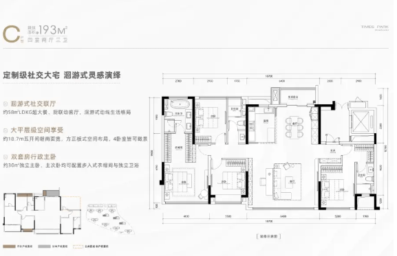 项目主力产品为建面约143-226㎡的全系四房精装大平层,均采用LDKG一体式方厅设计,面向改善家庭,强调空间互动与公园景观的深度融合。