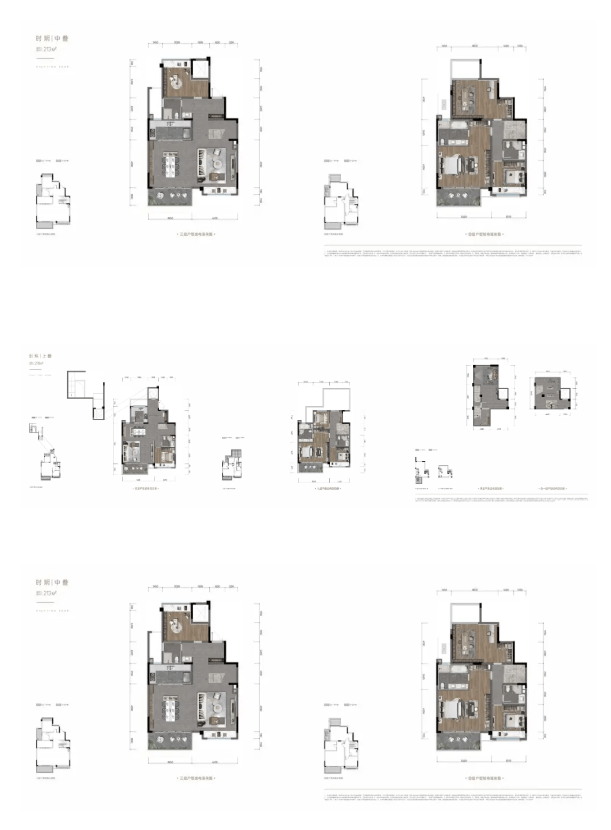 此产品系为项目的压轴藏品,分为上、中、下叠,面积约213-315㎡。其中下叠户型享有约50-200㎡的私家庭院,实现了别墅级的空间体验与天地归属感,是追求终极栖居、家族传承的塔尖人物的终极之选。