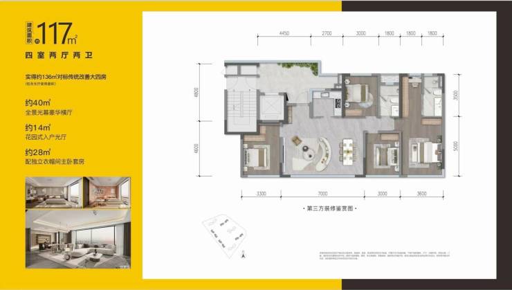 ?建面117㎡,实得约136㎡四房双卫,约14㎡独立光厅入户,联动厨房生活空间,约17米超大面宽设计,采光景观极致享受,约40㎡幻变大横厅,超30㎡奢阔主卧套房搭配全尺寸次卧。