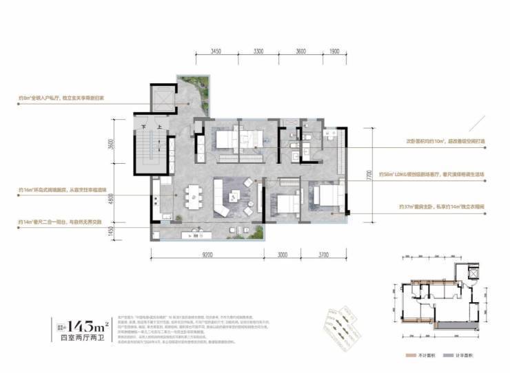户型亮点:约8㎡全采光入户私厅,约4㎡800库储藏空间;约50㎡LDKG超越级宽奢方厅,领衔主流改善;约24㎡星级套房主卧,约6㎡衣帽间,赋予高贵生活仪式;约14m奢尺面宽,约10㎡百变空间,理想随心所变