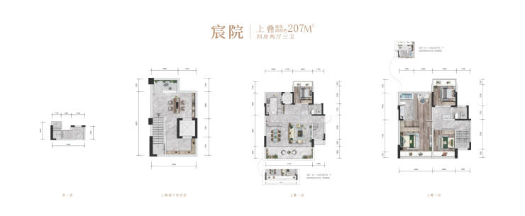 上叠户型:198-217㎡(四室两厅三卫),附带58㎡私家庭院,总价480-520万
