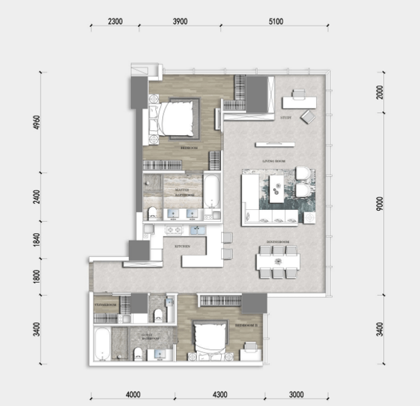 DKB 一体化设计(客厅 + 餐厅 + 西厨连通,面积超 40㎡),搭配约 7.5 米 270° 环幕阳台(可俯瞰大源中央公园),主卧带 “双台盆浴室”(配备浴缸 + 独立淋浴区),预留 “书房 + 家政间”(面积约 8㎡)