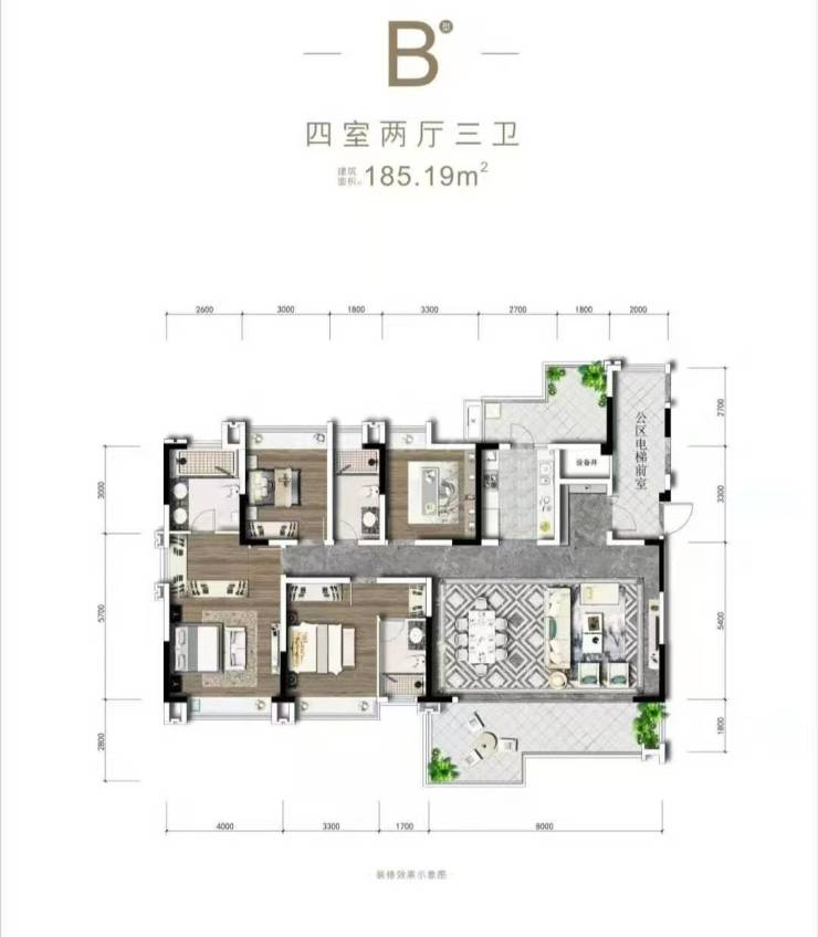 户型面积185㎡左右套四三卫,3.3米奢阔层高,定义居住新高度。双玄关入户门,户户独享约12㎡阔气公区电梯前厅,双L形阳台更实用