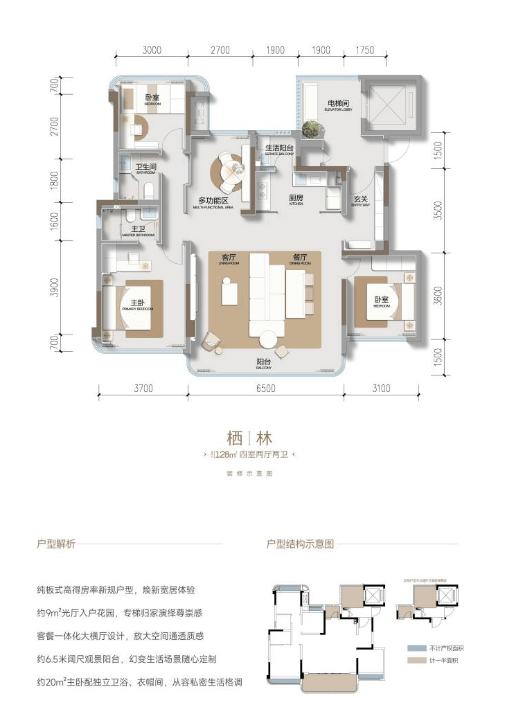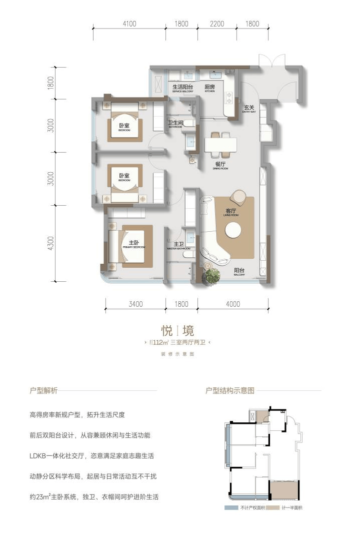 产品核心优势:项目最突出的亮点之一是实现了约114%至115%的高得房率,这意味着相同建筑面积下,能获得远超市场常规水平的实际使用空间,极大提升了居住的实用价值。