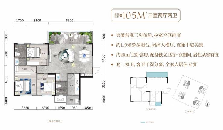 产品特色:创新大横厅设计,三面采光中庭视野。科学动静分区,多功能次卧设计,完美适配多代同堂家庭改善需求。