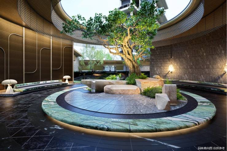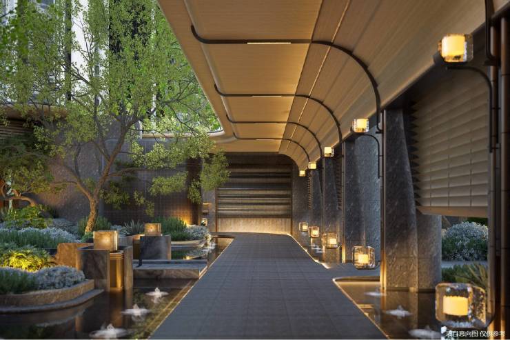 “3A黄金法则”——惊艳(Amazing)、美学(Aesthetic)、宜居(Auspicious)为指引,打造约2万㎡围合园林,以约百米中央景观轴串联十三处沉浸式景观节点。