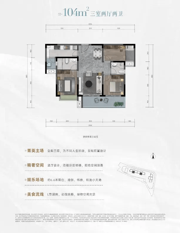 作为入门级产品,总价约170万起。采用竖厅设计,在约104㎡面积内高效布局三房,得益于约88%的高得房率,实际使用空间阔绰,是年轻家庭或精英人士首置主城核心区的性价比之选。