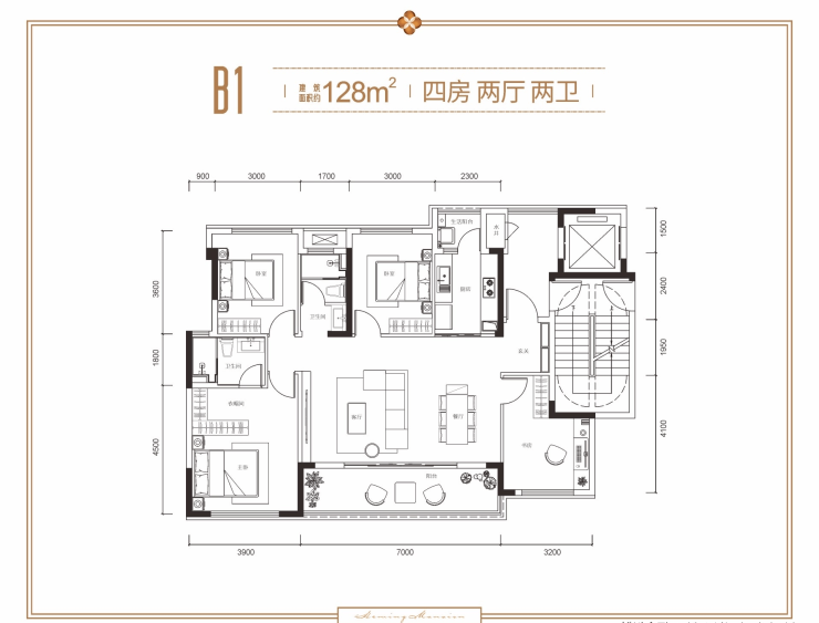 B1户型 约128㎡ 四室两厅双卫双阳台