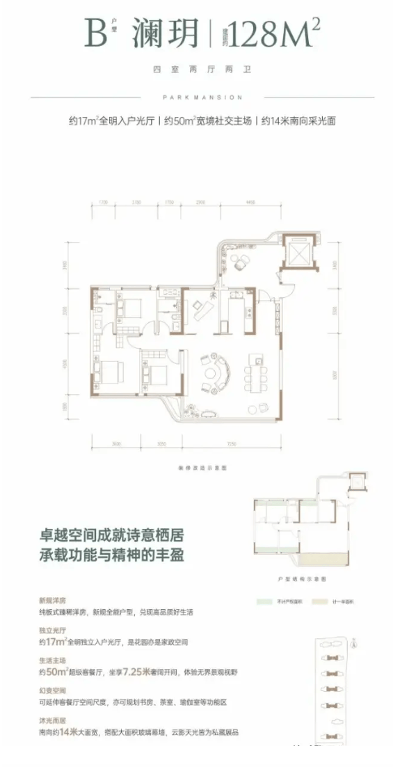 作为项目的入门级改善户型,在约128平方米的尺度内,充分贯彻新规设计理念。户型格局力求方正通透,功能分区清晰合理,精装交付省去装修烦恼。该户型适合追求一步到位、注重居住品质与实用性的首改或品质改善家庭。