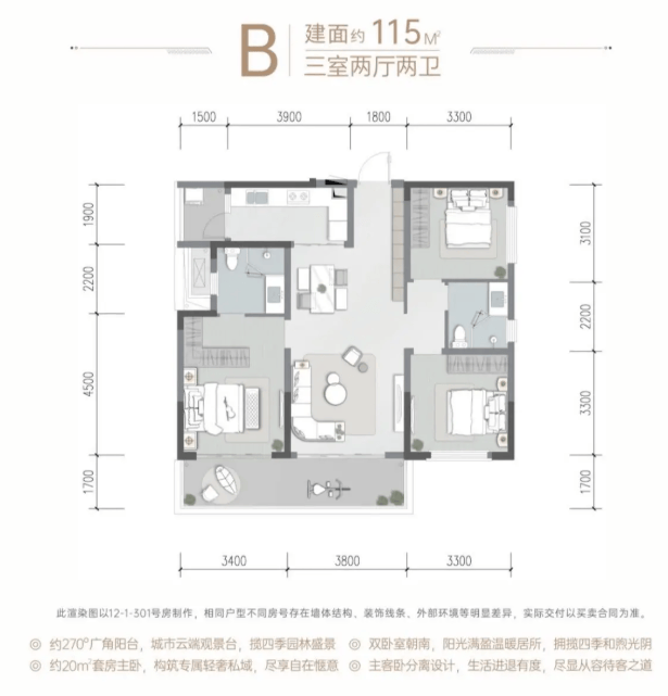 格局亮点:创新设计约8米宽景观阳台,连接客厅与次卧,拓展了休闲观景空间。采用主卧套房设计,保障主人私密性,整体布局方正实用。