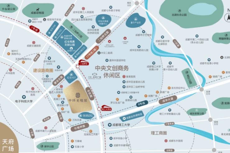 2. 成华区黄金改善地段:项目择址文旅成华,巧妙占据“东进”与“中优”两大城市战略的红利地带。这里坐拥3000亩成片开发区域,无疑是未来十年主城改善的黄金区域,发展潜力巨大。