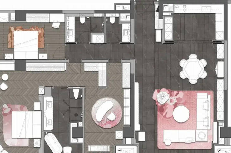 "芙蓉花"主题精装,78㎡餐客厅搭配68㎡全景主卧,空间尺度媲美豪宅标准。采用编织皮革与木饰面混搭工艺,展现非凡品质。