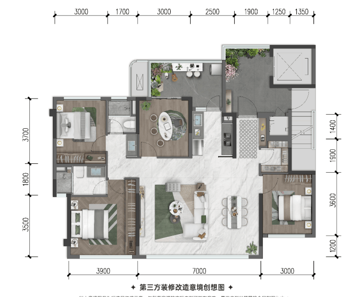 四室两厅两卫,独立电梯厅入户;7米客厅面宽,动静分区;赠送空中院落。