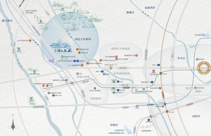 项目地处温江核心区国色天乡板块,距成都主城仅15公里。轨道交通优势显著:地铁4号线直达城区,17号线、19号线双轨交汇。紧邻19号线黄石站,可快速抵达双流及天府国际机场。