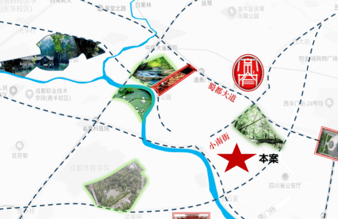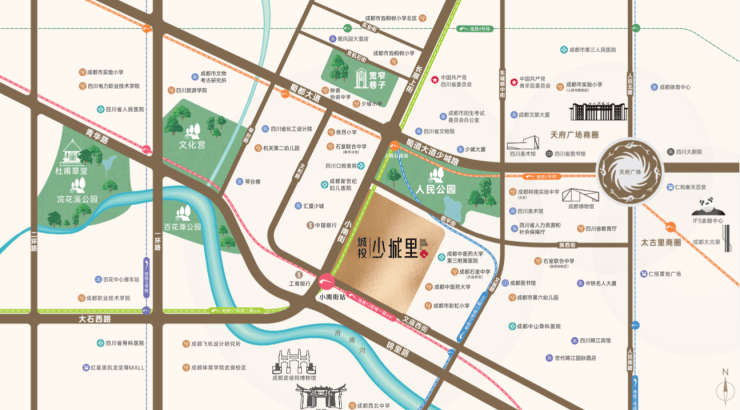 三大城市公园环绕(人民公园、百花潭公园、浣花溪公园),实现"出则繁华,入则宁静"的居住理想