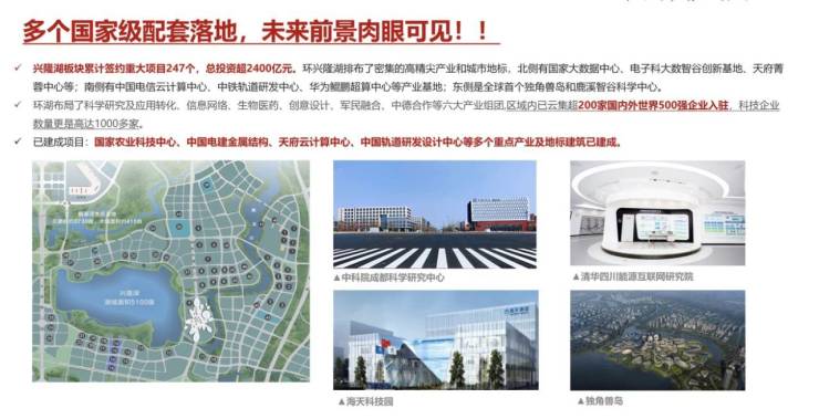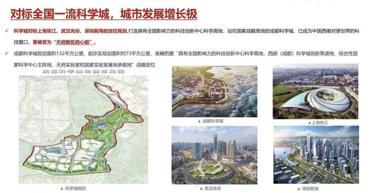 中国西部科学城——天府新区大脑,天府新区发展最早,呈现最早的板块,布局了信息网络,生物医药,科学研究及应用转化,军民融合,国际合作,创新设计六大组团,总投资额超千亿,打造世界科技高地。