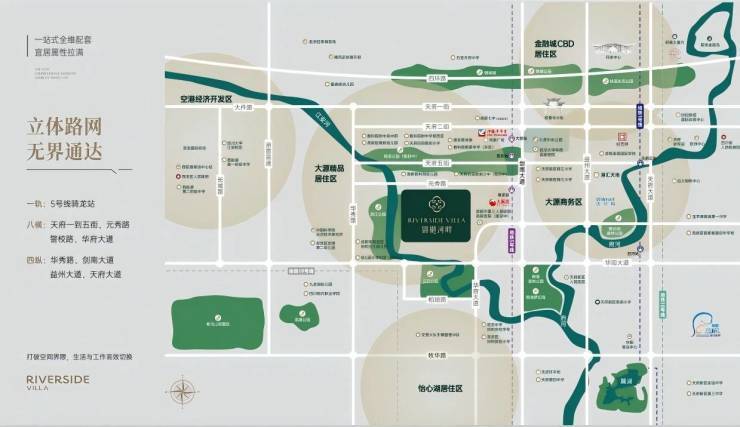 主干道——项目北侧天府一到五街,元秀路以及项目南侧的华府大道以及警校路,东侧的剑南大道、益州大道和天府大道都是直连绕城直达三环,通达全城。