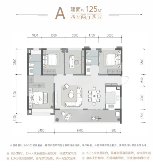格局亮点:升级为功能完备的四房,满足多房间需求。拥有约8.6米全景阳台,室内实现明厨明卫,通风采光条件更佳,居住健康度更高。