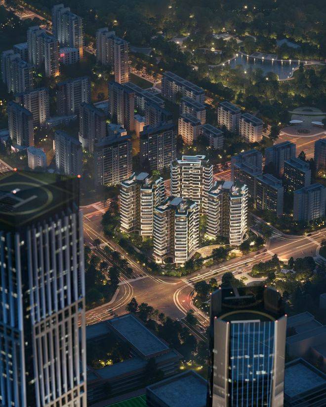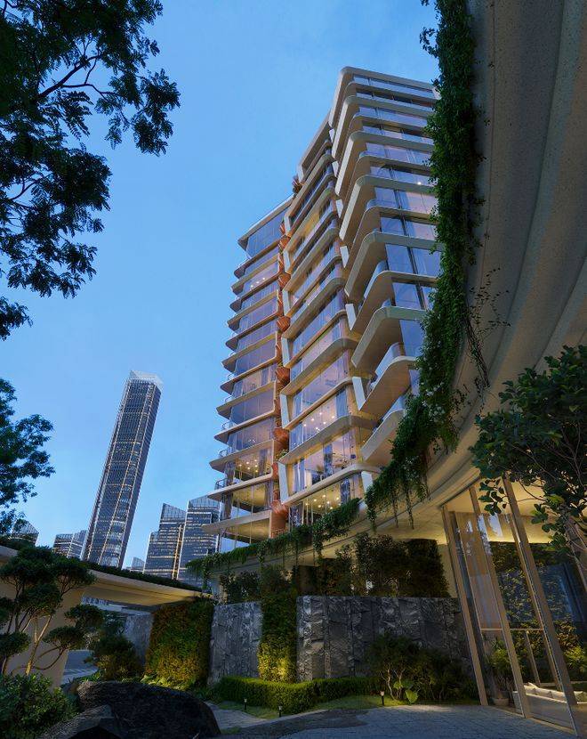 外立面摒弃传统玻璃幕墙,采用暖色仿石铝板与铜色栏杆,而最新调规后增加的玻璃比例进一步强化了“全景舱”视野。