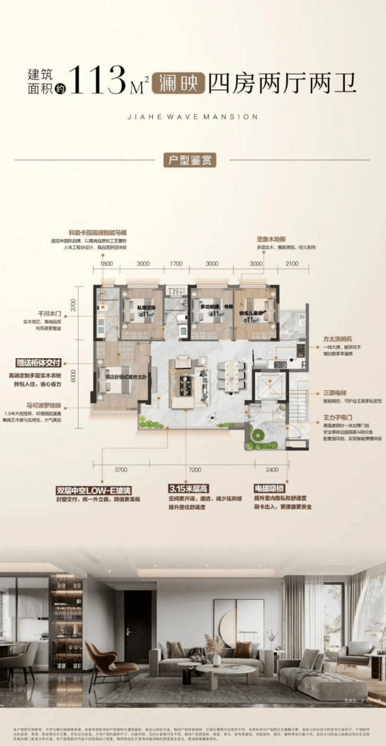 此户型是高功能性设计的典范,在约113㎡面积内实现四房布局,空间利用率极高。户型拥有
