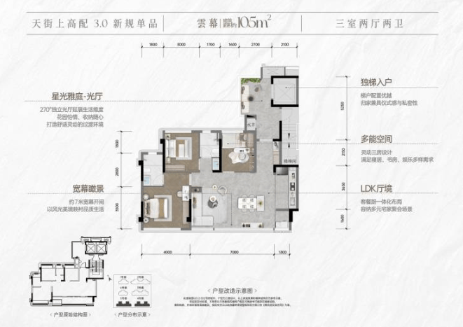 作为项目的主力户型,定位为高品质的刚需及首改产品。三房设计功能完备,能够满足年轻家庭或三代同堂的基本空间需求。结合项目优越的地铁口位置、TOD综合配套与未来龙湖天街的商业能级,是入驻青羊新城核心区的高性价比优选。