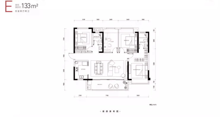 E户型:133㎡四房两厅双卫