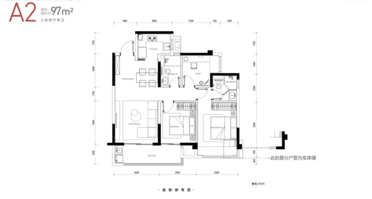 A2户型:97㎡三房两厅双卫