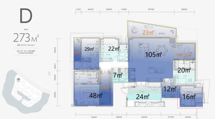 326㎡,总价1100-1200左右/(少一个阳台307㎡总价减100万)